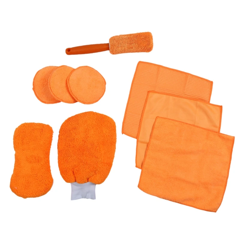 9Pcs Microfiber Car Wash Cleaning Kit Car Tire Brush Glass Towel Wax Cake Leather Vent Interior